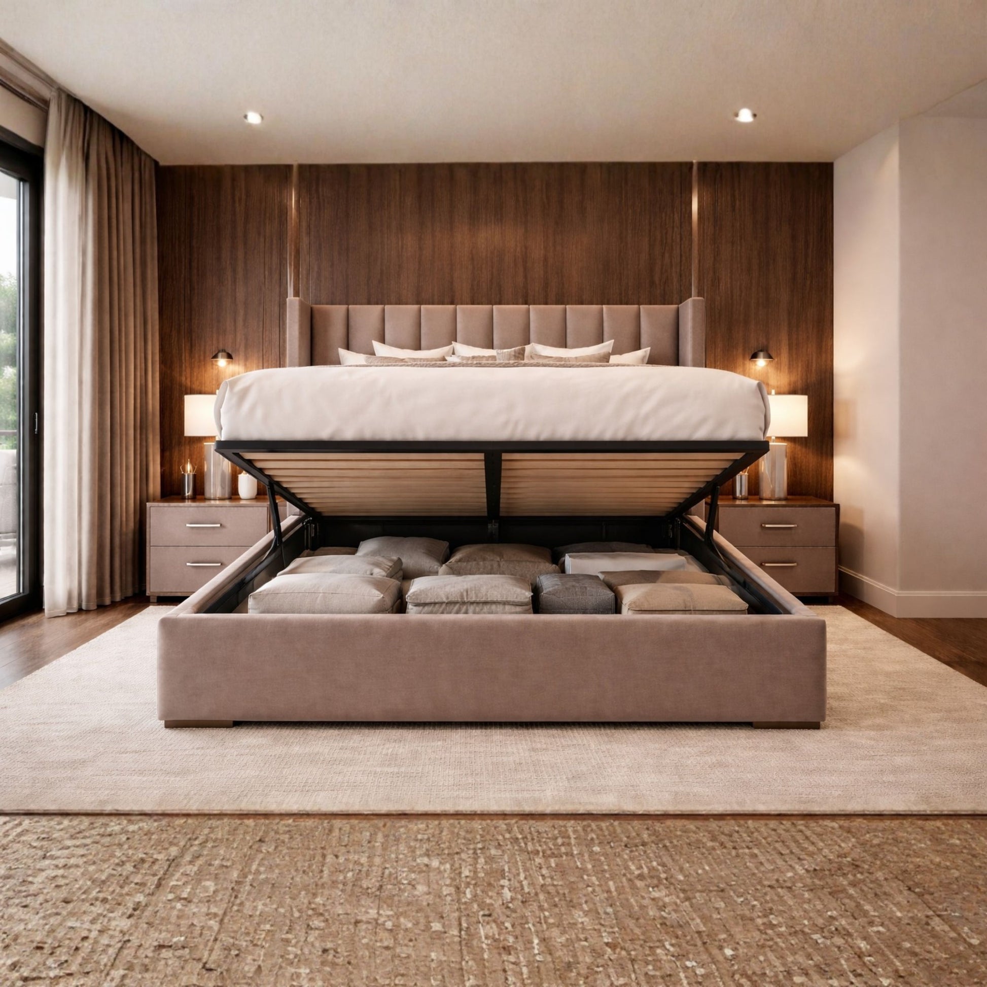 This bed is available with an optional ottoman gas-lift storage system, providing a generous hidden storage space beneath the mattress—ideal for bedding, pillows, clothes, and seasonal items.