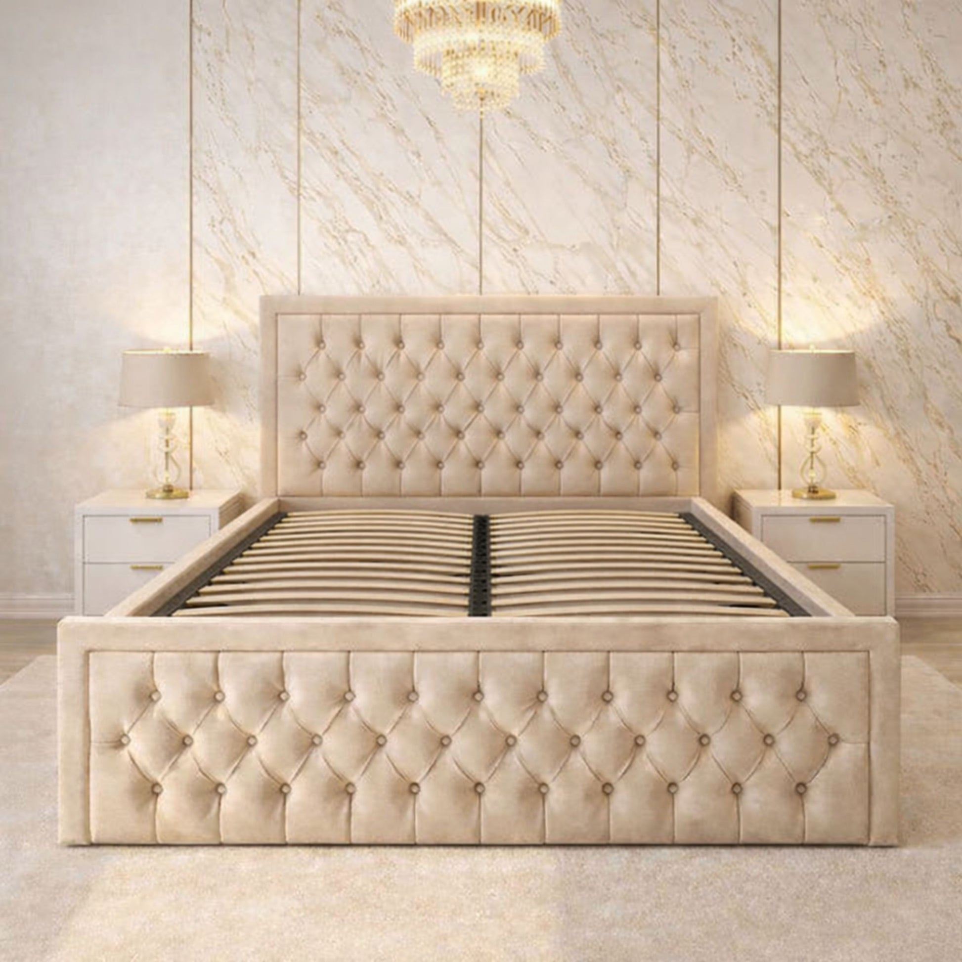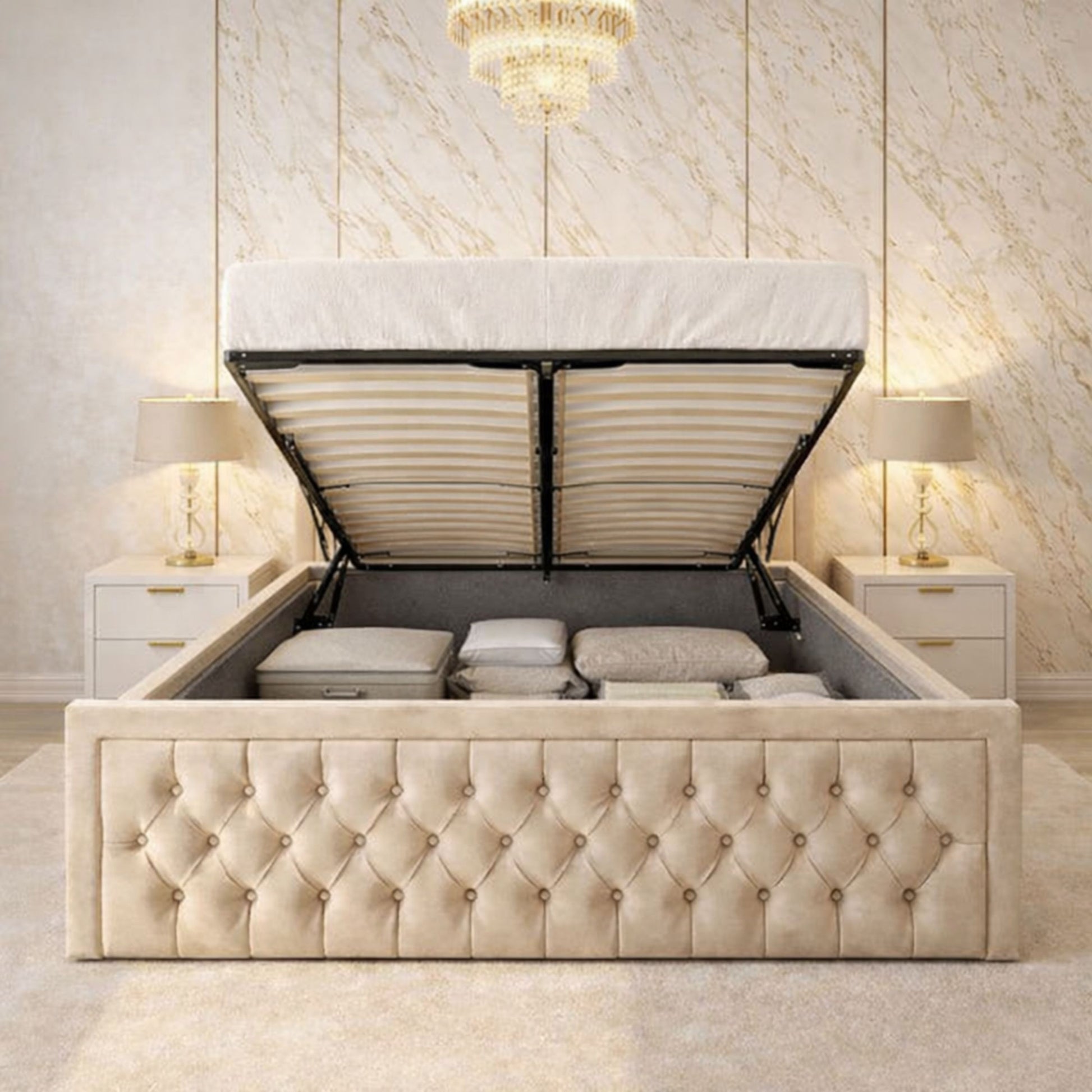 This bed is available with an optional ottoman gas-lift storage system, providing a generous hidden storage space beneath the mattress—ideal for bedding, pillows, clothes, and seasonal items.