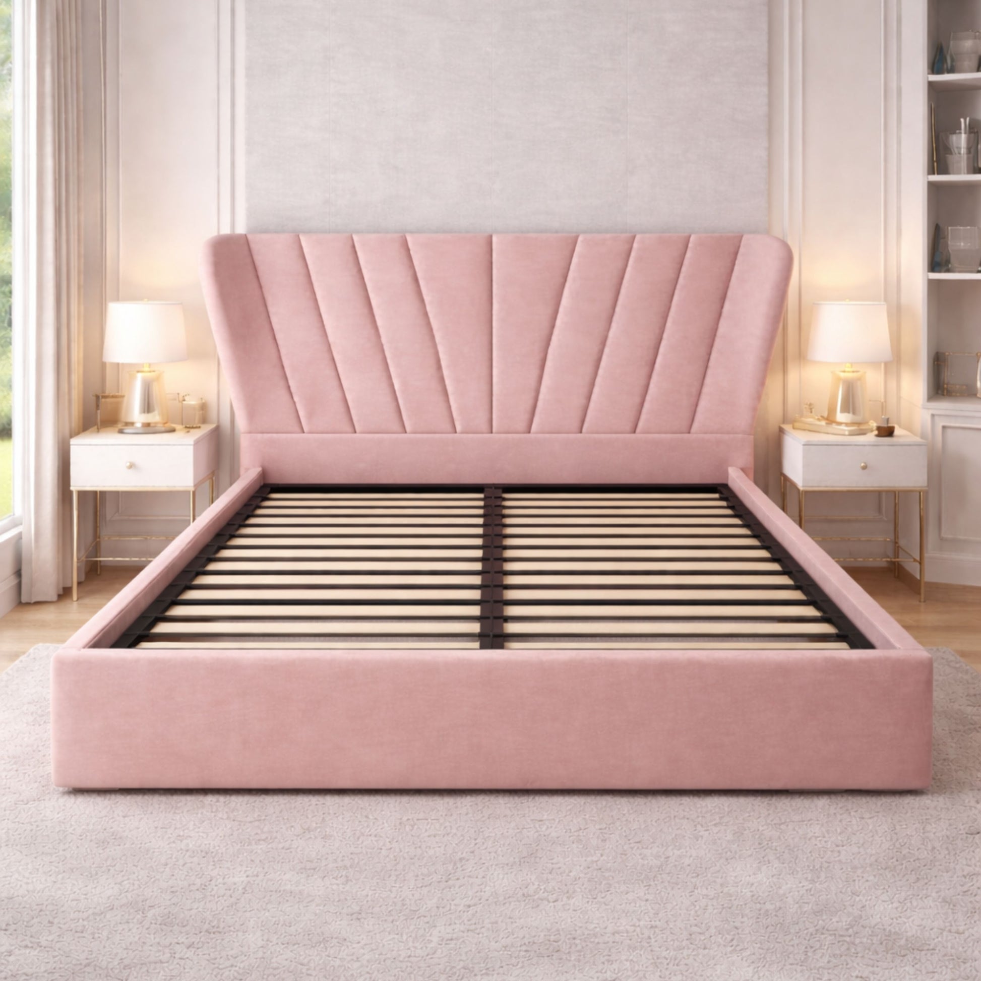 This bed is available with an optional ottoman gas-lift storage system, providing a generous hidden storage space beneath the mattress—ideal for bedding, pillows, clothes, and seasonal items.