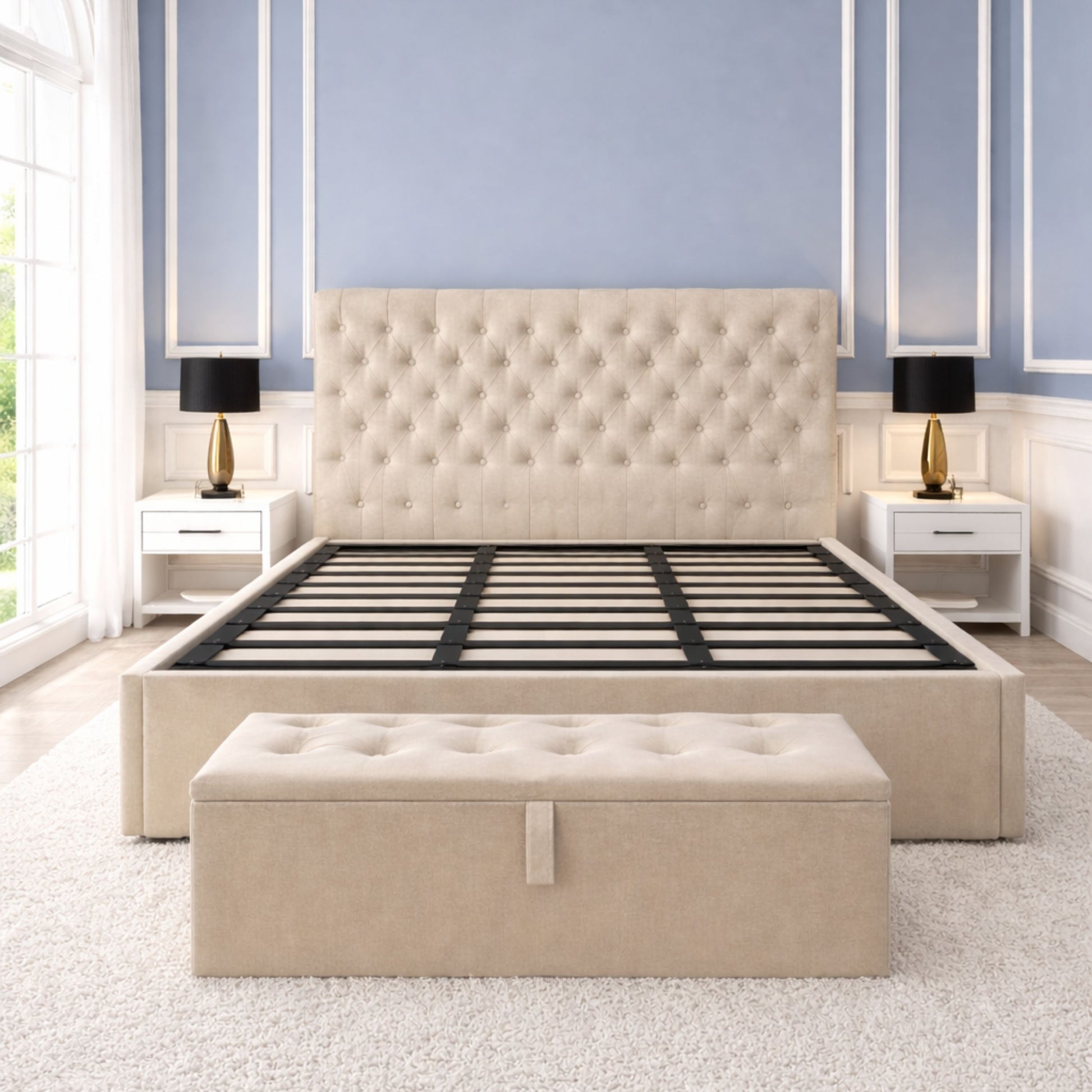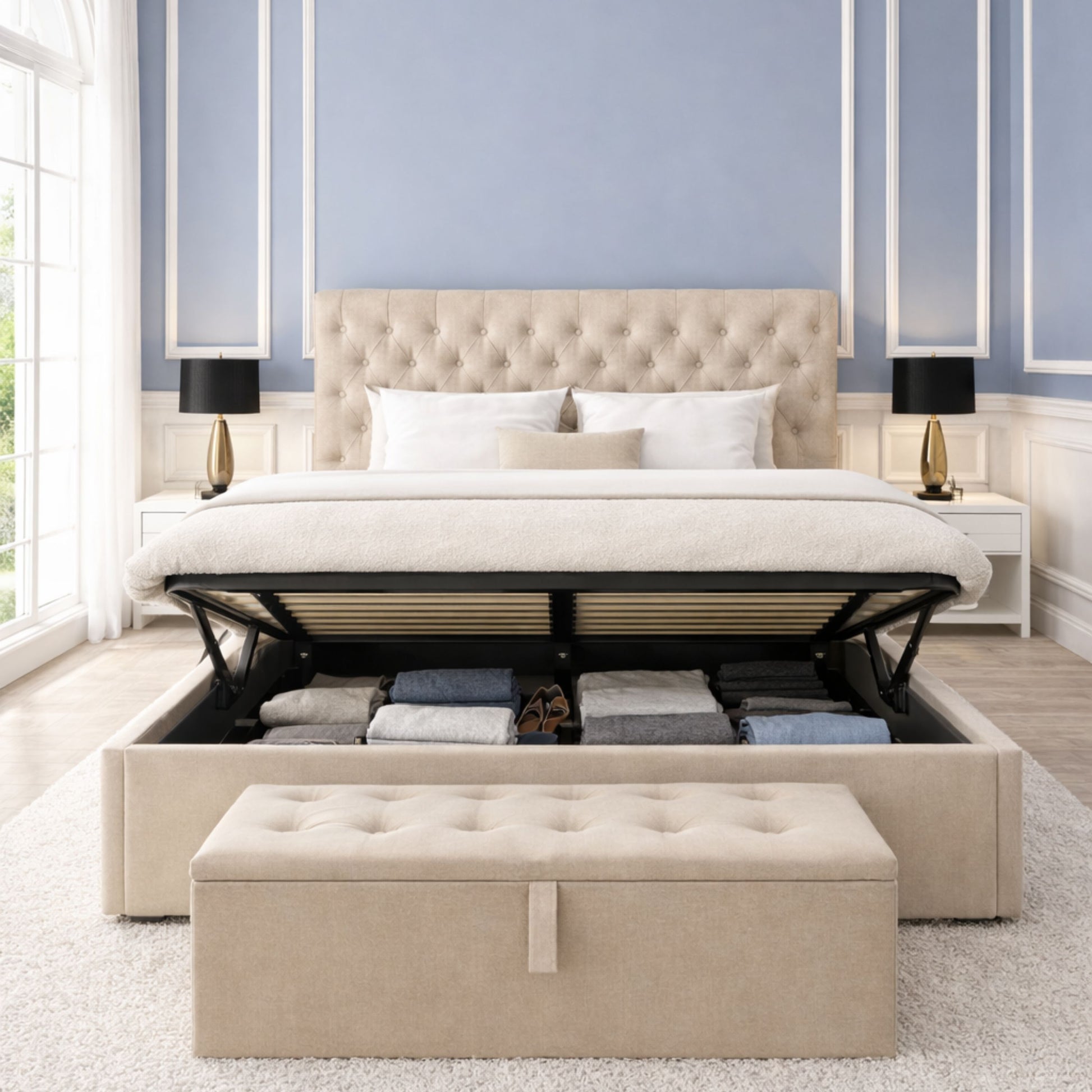 This bed is available with an optional ottoman gas-lift storage system, providing a generous hidden storage space beneath the mattress—ideal for bedding, pillows, clothes, and seasonal items.