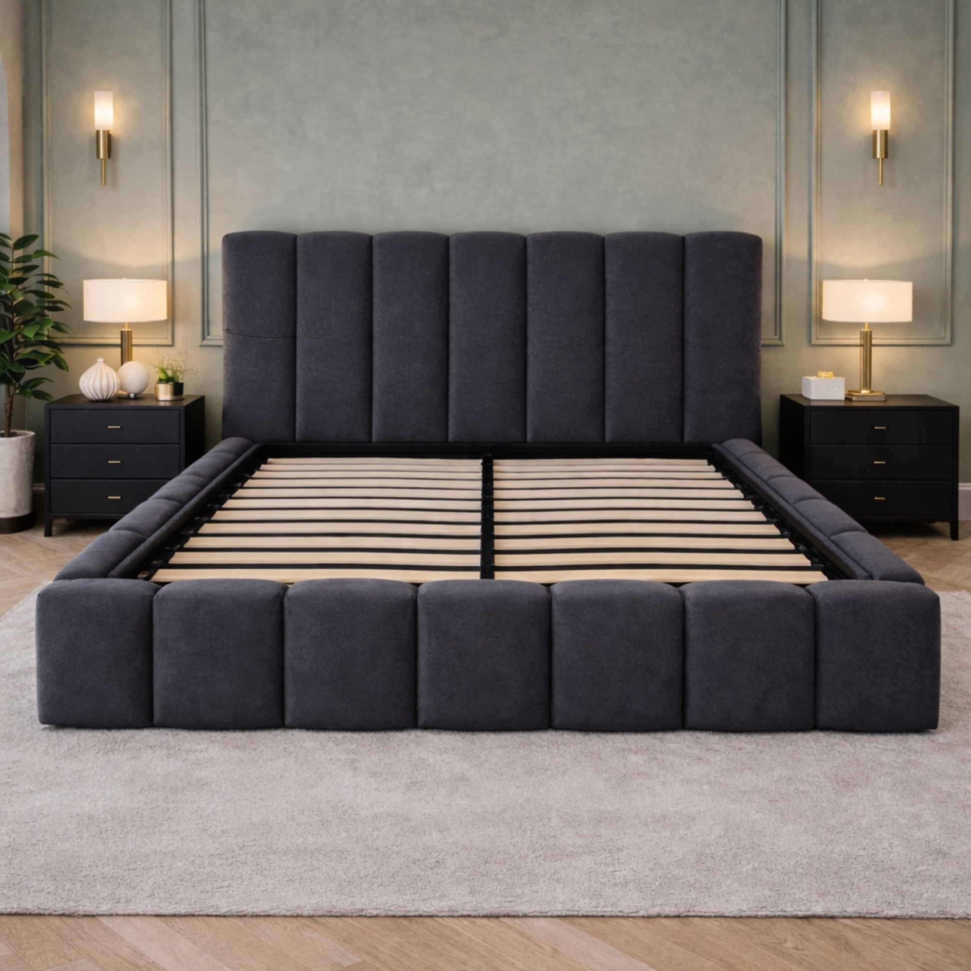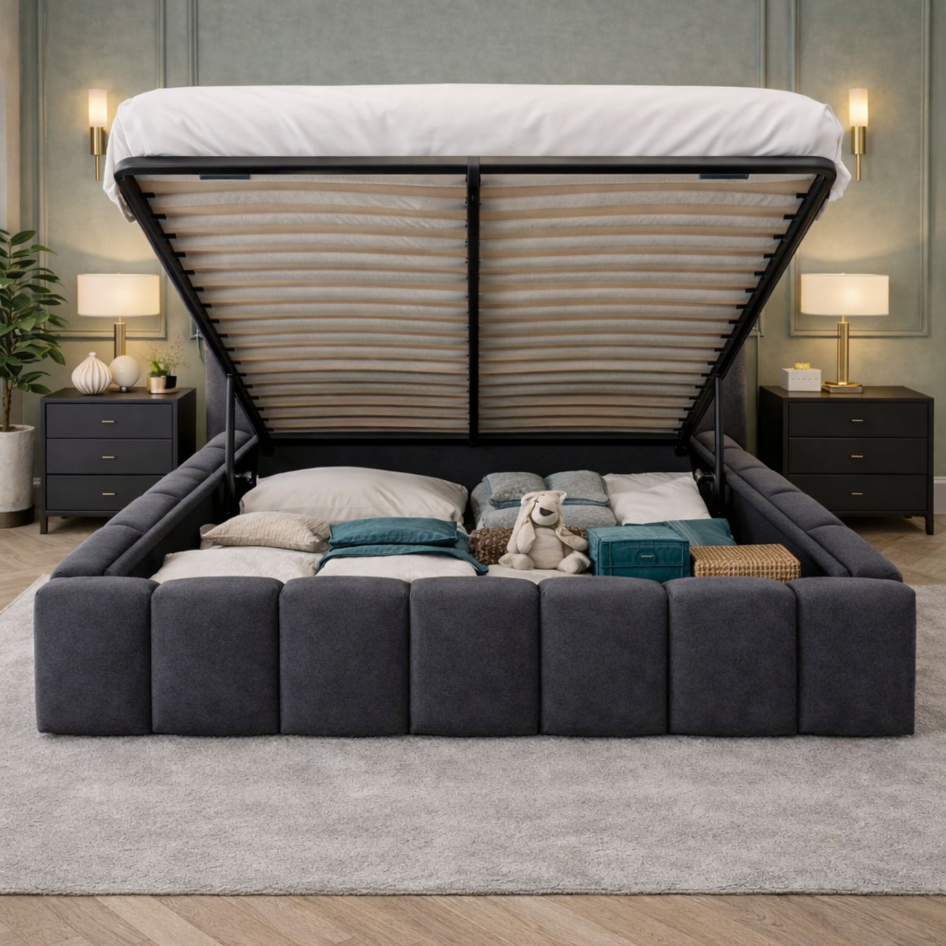 This bed is available with an optional ottoman gas-lift storage system, providing a generous hidden storage space beneath the mattress—ideal for bedding, pillows, clothes, and seasonal items.