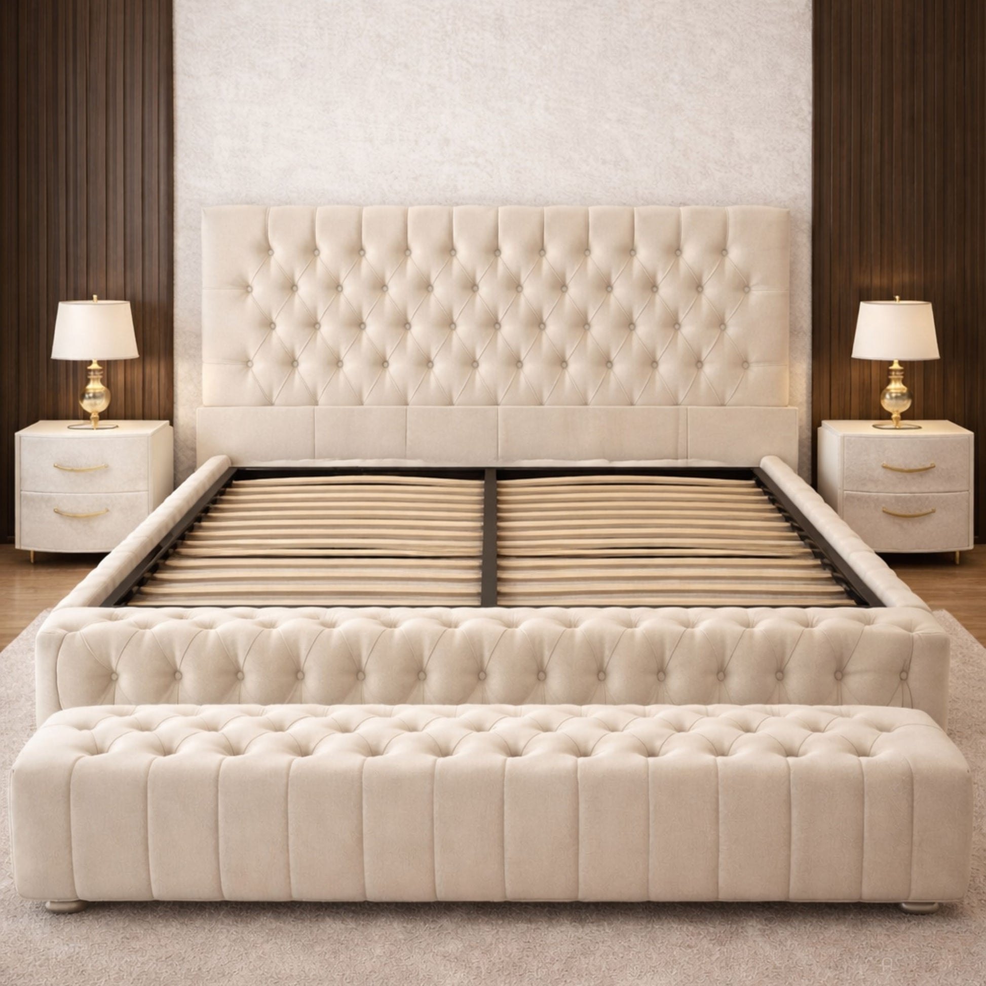 This bed is available with an optional ottoman gas-lift storage system, providing a generous hidden storage space beneath the mattress—ideal for bedding, pillows, clothes, and seasonal items.
